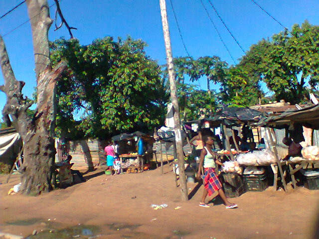 Nadat hul weg is daag Petrus op en ons ry om by die kwekery te gaan kyk hoe dit daar lyk. Langs die pad sien ons ‘n paar plante en daar is papajaboompies, ons stop en vra. Hy verstaan bietjie Engels en skryf op die grond dat dit 25metikas een is, ons vra watter is manlike plante en watter dra vrugte, hy weet nie maar sê ons moet al 4 vat omdat hy nie weet nie vir 50metikas. Terwyl ons nog daar staan daag Joao (ons gids van die vorige naweek) daarop en hy ry saam na die kwekery, maar ons kry nie waarna ons soek nie. Ons soek nog na ‘n vrugte- en groentemark en hy laat ons ‘n bietjie verder noord ry. Dis sommer so langs die pad en op die grond wat hul ware uitgestal word en hul skermpie se dak is ‘n paslaken wat oor stokke gehak is. Ons koop ‘n klapper of kokosneut (die wat klapperhaar matrasse van gemaak is en die witklapper wat gerasper is en vir koekies gebruik word) en sulke witterige patattas wat ons dieselfde aand eet en nogal lekker is.